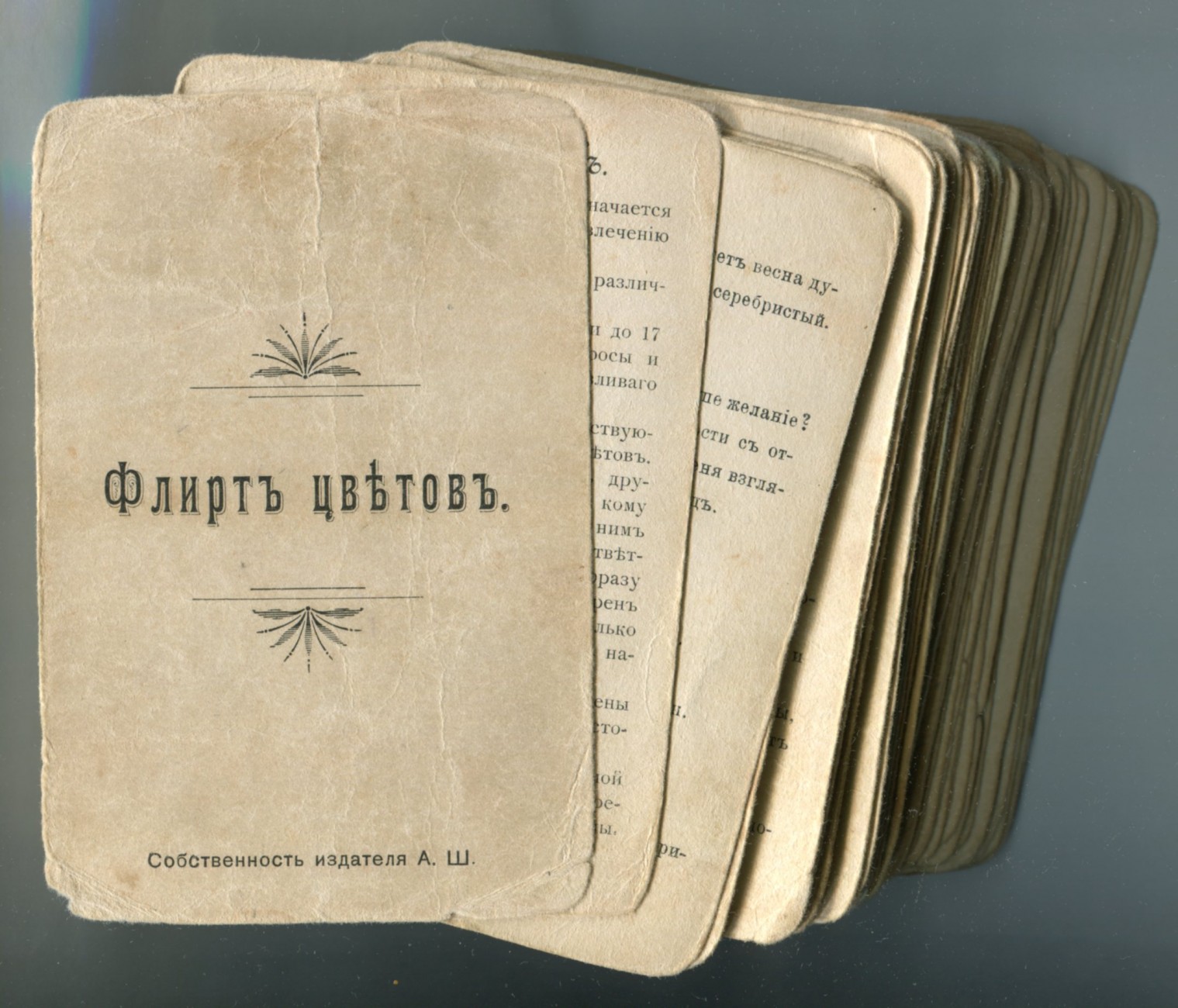 В 2011 году Татьяна Васильевна Церковницкая передала в дар музею салонную карточную игру «Флирт цветов» (фото 1), очень популярную в России в XIX веке. Хождение в гости и приглашение гостей было одной из распространенных форм досуга у интеллигенции того времени. Прием превращался в вечер, полный светских бесед, стихов, музыки и игр.