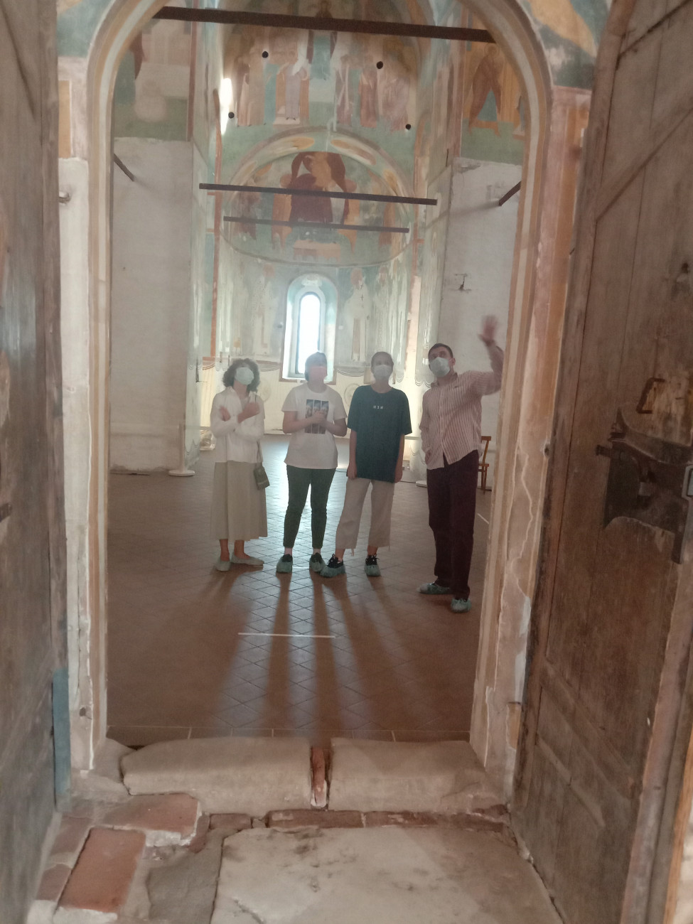 Музей фресок Дионисия предлагает своим посетителям тематическую экскурсию по стенописи Дионисия в соборе Рождества Богородицы. Продолжительность экскурсии – 45 минут. Тематическая экскурсия по стенописи Дионисия состоит из следующих блоков: рассказ о строительстве собора Рождества Богородицы, краткие биографические сведения о Дионисии, рассказ о технологии создания стенописи, перечисление сюжетов портальной росписи на паперти, перечисление основных сюжетов в интерьере собора, рассказ о реставрации стенописи Дионисия в ризнице и на паперти собора. В данной статье мы будем рассматривать методику представления сюжетов стенописи Дионисия, так как рассказ о времени строительства собора, других работах Дионисия, технологии и реставрации стенописи представляет собой краткое последовательное перечисление фактов.