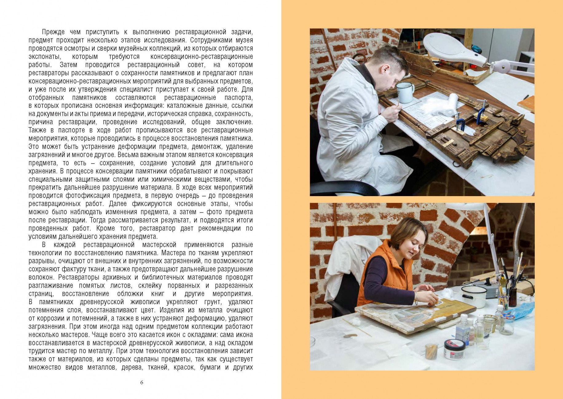Реставрация движимых и недвижимых памятников истории, культуры и искусства является одной из важнейших задач любого музея. Само слово «реставрация» подразумевает восстановление, возобновление какого-либо предмета в первоначальном или близком к первоначальному виде с целью сохранения его исторического и художественного значения. В фондах Кирилло-Белозерского музея-заповедника хранится немало предметов, имеющих огромную ценность и нуждающихся в восстановлении. Основной фонд музея составляет около 60 000 единиц хранения и более 10 коллекций. Самыми крупными из них являются коллекции археологии, отдела письменных источников, а также коллекция народных тканей, церковных тканей, живописи, графики, древнерусской живописи, археологии, драгоценных металлов, нумизматики, металла, керамики, дерева. Для восстановления столь большого числа экспонатов реставраторы музея ежегодно проделывают огромную и сложную работу, чтобы сохранить как можно больше ценных предметов. И эта работа ведется уже несколько десятилетий.
