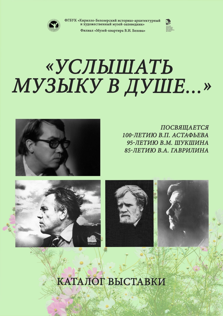 Выставка «Услышать музыку в душе…» объединяет четырех выдающихся мастеров слова и музыки – Виктора Петровича Астафьева, Василия Ивановича Белова, Василия Макаровича Шукшина и Валерия Александровича Гаврилина, творческое наследие которых является неотъемлемой частью русской культуры. Связующим звеном в осмыслении переплетения их судеб стала Вологда – город, где «краски земли и неба по-акварельному прозрачны и чисты, а леса хранят девственное величие, бьют древние родники, питающие былинные, сказочные, песенные сюжеты и образы, их узорный, словесный лад» (Вс. Сурганов).