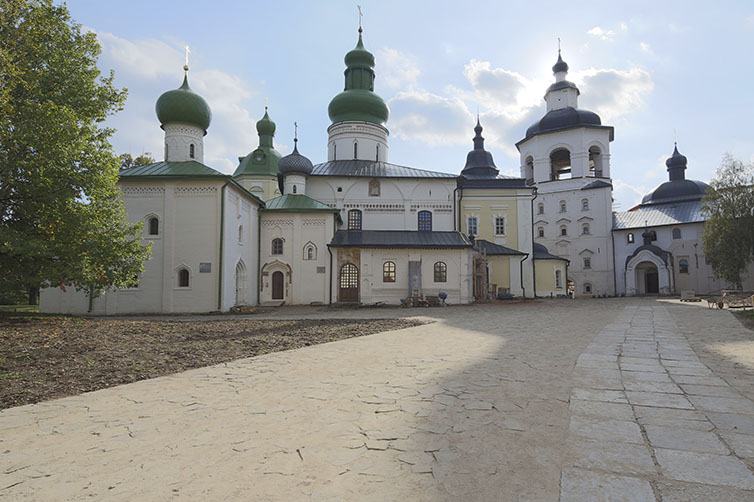 Успенский собор был возведен в 1496 году на месте двух деревянных храмов, в течение столетия последовательно сменивших друг друга, ‒ первой церкви Успения Богородицы, выстроенной в начале XV века, и одноименной второй, более просторной, сооруженной в 1436 году и впоследствии сгоревшей. Возведение собора положило начало каменному строительству в Кирилло-Белозерском монастыре и нашло отражение в ранних документальных источниках: «Почали ставити церковь в Кирилове монастыре каменую Успения Богородицы, а поставили в пять месяцев, а стала в пол-третья ста рублев, а мастеров было стенщиков 20, а был болшой мастер Прохор Ростовской». В 1497 году собор освятили. Успенский собор ‒ один из первых каменных храмов, возведенных на Русском Севере. До его появления на Белозерье были выстроены два каменных собора — Преображенский (1481) в Спасо-Каменном монастыре и Рождества Богородицы (1490) в Ферапонтовой обители. В летописях собор Кирилло-Белозерского монастыря назван «великой церковью». Это четырехстолпный, крестовокупольный, одноглавый храм с тремя апсидами. В его архитектуре прослеживаются черты московского зодчества с псковско-новгородской системой декорации. Со временем проведенные перестройки изменили первоначальный вид памятника.