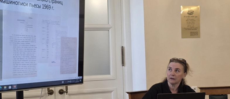 В этой же секции прозвучал и второй доклад, посвященный первой беловской пьесе В.И. Белова «Не спи на закате» и особенностям работы с ней сторонних исследователей. Напомним, драматическое произведение было написано автором в 1969 году и сохранилось в единственном машинописном экземпляре в архиве писателя (Музей-квартира В.И. Белова, Вологда). Его представила ведущий научный сотрудник Музея-квартиры Белова Эльвира Трикоз, которая отметила: «Ученым сотрудникам РГБ было интересно узнать о том, как идет научная и фондовая работа в музее – на секции присутствовали непосредственно те, кто хорошо знает рукописные фонды и самого Василия Ивановича, и его друга А.Д. Заболоцкого, и близкого окружения классика.