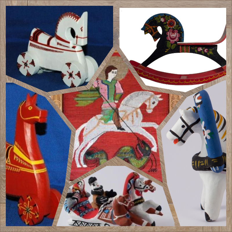 На площадке интерактивно-познавательного центра «Зеленая планета» ФосАгро, г. Череповец, Северное шоссе, 36, из фондов музея представлены кони и лошадки - глиняные, деревянные и живописные, на марках, фото и открытках, на прялках и в книгах.