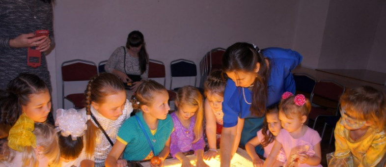 During the performance, kids together with the fairy characters sang and danced, recited poems, participated in games, and painted with sand on special illuminated tables.