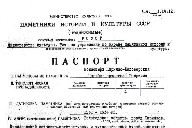 В 2015 году на объекты культурного наследия Кирилло-Белозерского музея-заповедника были изготовлены архитектурные паспорта (паспорта объектов культурного наследия) по новой форме, утвержденной Приказом Министерства культуры от 11 ноября 2011 года № 1055[i]. Архитектурные паспорта старого образца были выполнены в 1976–1989 годах специалистами главного управления по охране памятников истории и культуры: старшим архитектором Шередега В.И., искусствоведами Подъяпольским А.С., Троскиной Н.Д., Машковой В.П.