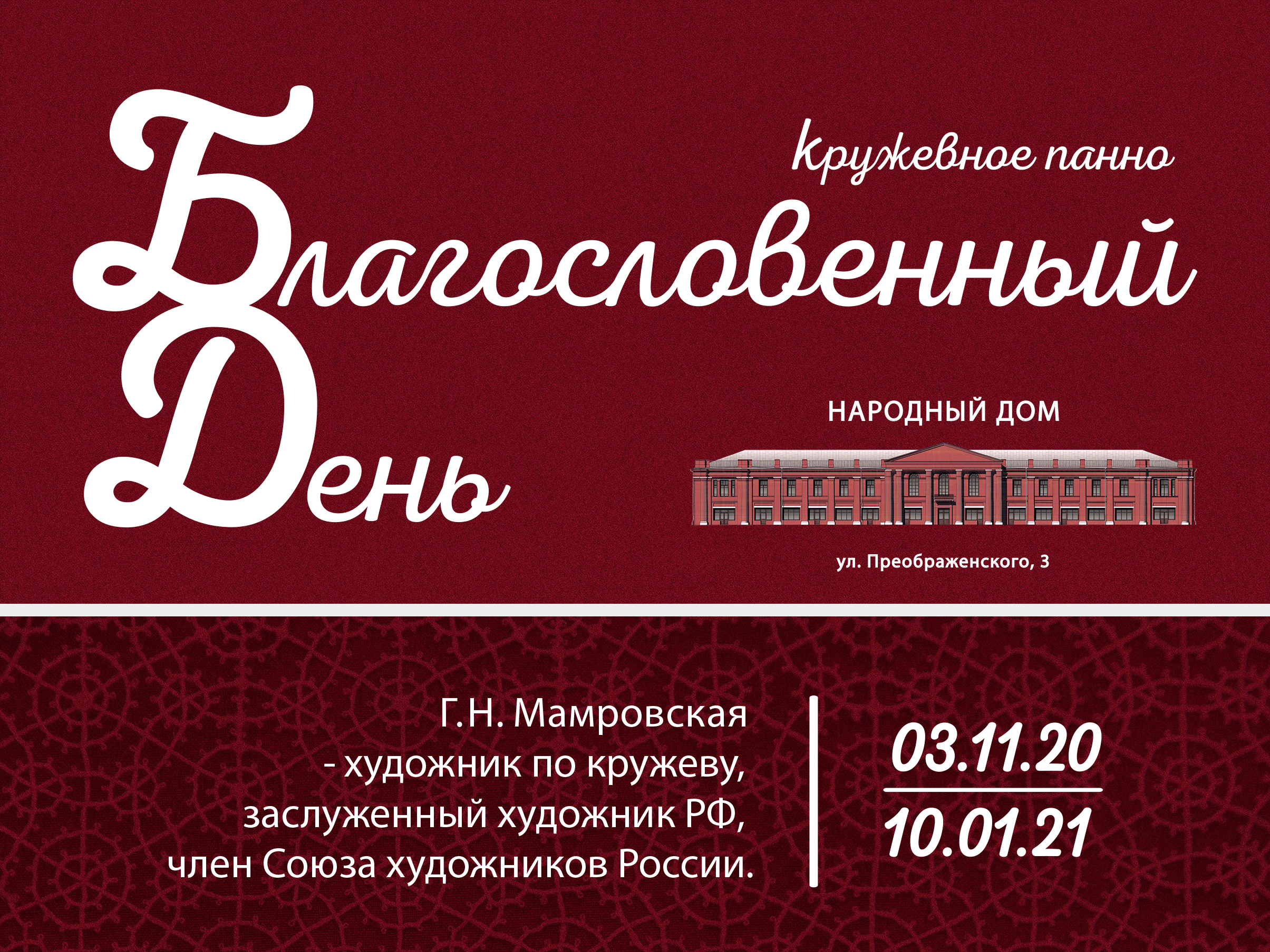 На кружевном панно «Благословенный день» представлен Кирилло-Белозерский монастырь и его архитектурные памятники со стороны Сиверского озера. В центре – монастырские стены и башни: Московская, Белозерская, Поваренная, Хлебенная, Свиточная. На заднем плане – многочисленные сооружения монастыря. Архитектурные здания уравновешиваются мягко изогнутыми ветвями растений и цветочными розетками.
