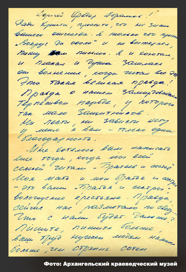 В письме от 15 февраля 1963 года Белов сообщает Абрамову, что всей семьей читали «Братьев и сестер». «Моя мать и мои братья и сестры – это Ваши братья и сестры, вологодские крестьяне».