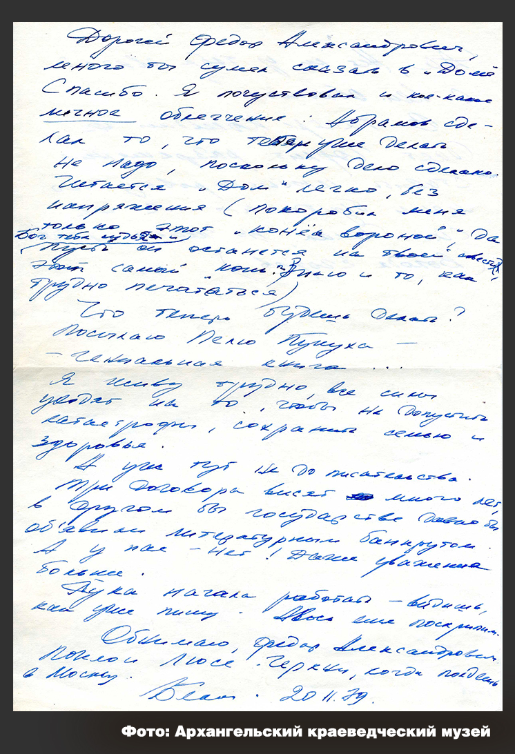 В воспоминаниях современников не раз отмечено, что Абрамов хвалил Белова, защищал, если это было необходимо, – на правах старшего. По-простому, по-свойски обращались другу к другу в письмах, иногда и с просьбами. В.И. Белов: «Дорогой Федор Александрович, много ты сумел сказать в «Доме». Спасибо. Я почувствовал и кое-какое личное облегчение. Абрамов сделать то, то теперь уже делать не надо, поскольку дело сделано…».