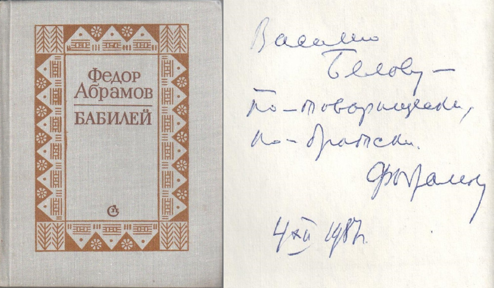 Более поздние сдержанны, спокойны, указывают больше на товарищескую связь, на отношения двух единомышленников. Все больше именно дела объединяют этих людей: «Василию Белову – по-товарищески, по-братски. Ф. Абрамов 4.XII. 1987 г.», «Василию Белову от Федора Абрамова. 14.XII.79 г.».