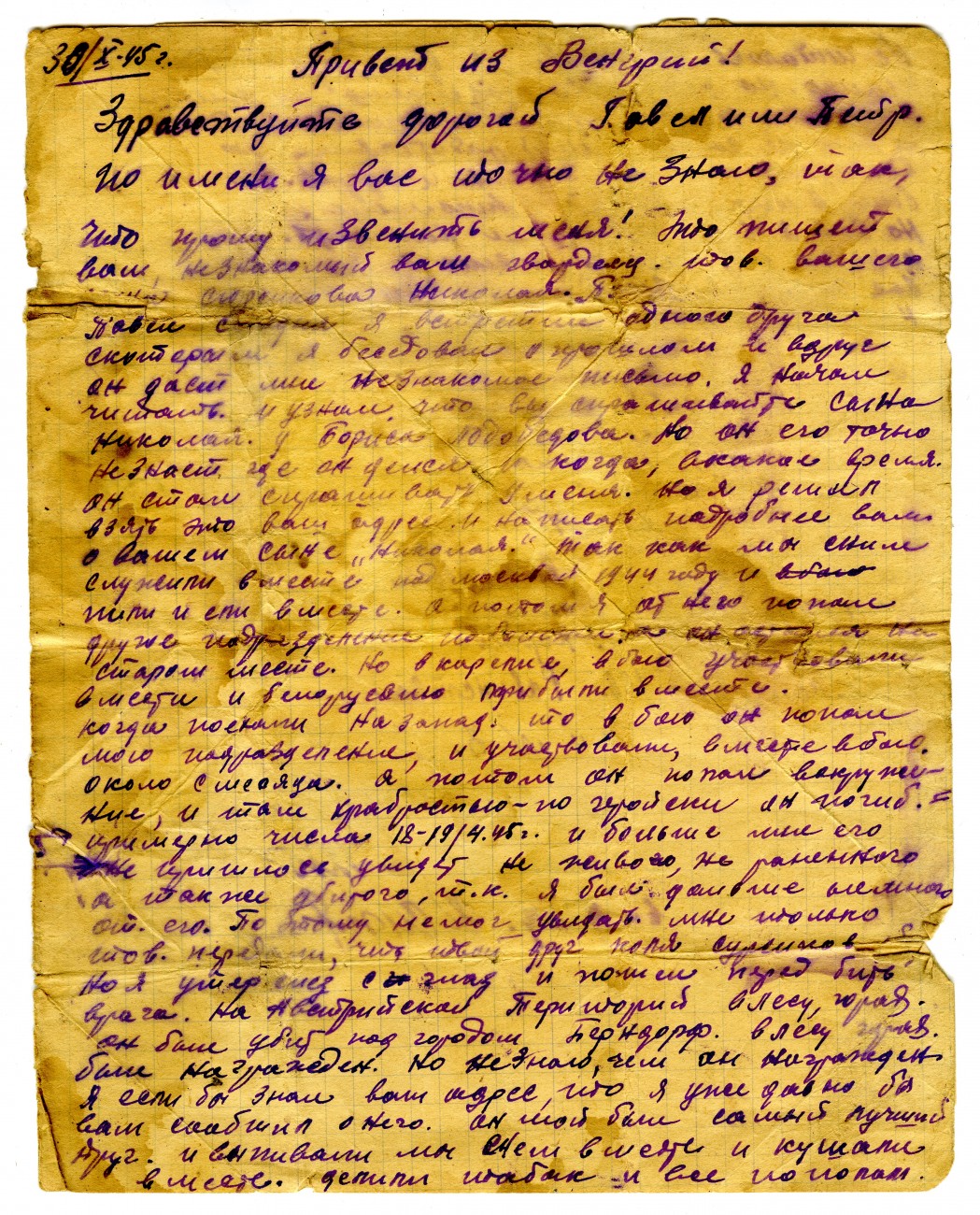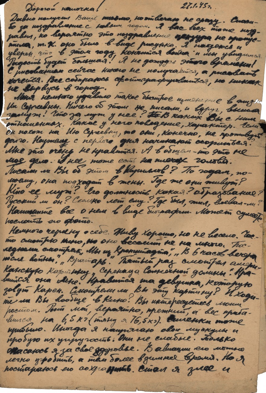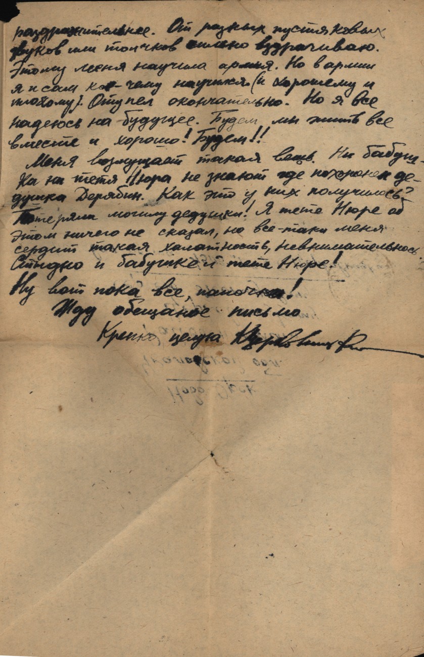 Участница войны. Доронина (урождённая Воронова) Александра Петровна родилась 3 июля 1924 года в деревне Борбушино Борбушинского сельского совета Кирилловского района в семье колхозников. Училась в Борбушинской начальной школе, Ферапонтовской семилетней школе, в 1942 году окончила Кирилловскую среднюю школу. 4 января 1943 года Александра Петровна была мобилизована в армию. Служила в 106 отдельном батальоне ВНОС радиооператором и радиотелеграфистом. После обучения и службы в Вологде и Прилуках воевала в Каунасе, Истенбурге, Кенигсберге. День Победы встретила в Восточной Пруссии. После демобилизации летом 1945 года работала заведующей избой-читальней, налоговым агентом в Борбушино, а с 1948 года трудилась в Кириллове в отделе культуры, районной библиотеке, районной киносети и районном узле связи. Запись сделана 19 мая 2005 года в городе Кириллове сотрудником Кирилло-Белозерского музея-заповедника Л.И. Глызиной.