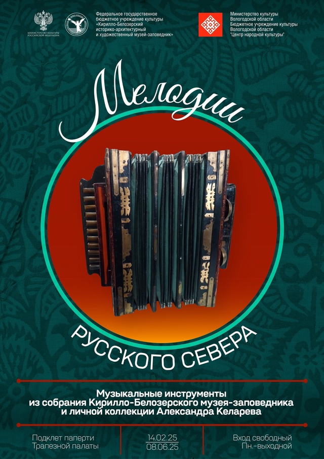 14 февраля 2025 года в подклете Трапезной палаты открылась выставка «Мелодии Русского Севера. Музыкальные инструменты из собрания Кирилло-Белозерского музея-заповедника и Александра Келарева». На выставке можно увидеть: пианино, мандолину, балалайку, игрушки-свистульки, гармони, детали инструментов, фотографии середины XIX –XX века из фондов музея и частной коллекции.