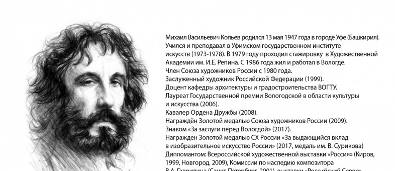 Копьёв Михаил Васильевич - художник яркого и многогранного дарования: живописец, график, карикатурист. Художник работал в жанрах сюжетной и портретной живописи. За свою творческую деятельность им созданы циклы живописных и графических произведений: «Евангельские и духовные сюжеты» (1990-2016), «Посвящение Первой Мировой» (2004-2014), «Современники» (1990-2016).