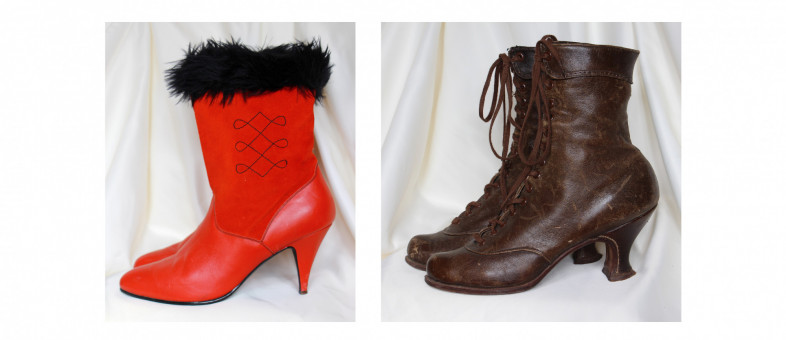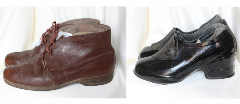 В конце XIX века в женскую моду прочно вошли высокие кожаные ботинки с мягким голенищем до середины икры. Горожанки носили их с длинным пальто. Высокие «французские» каблучки и узкая колодка подчеркивали изящество ноги, а прочная шнуровка надежно фиксировала стопу. Удобная и красивая конструкция высоких шнурованных полусапожек была в моде несколько десятилетий и неоднократно повторялась впоследствии. Крестьянка среднего достатка имела в своём гардеробе одну пару сапог или ботинок, которые нередко передавались по наследству дочери. Такая обувь надевалась только по большим церковным праздникам или на ярмарочные гуляния. Среди имеющихся на выставке кожаных изделий присутствуют три пары подобных ботинок. Они сшиты из качественной нежной кожи молодого животного, которая носила название «шевро». Эта кожа выделывалась из козьих шкур; чем моложе было животное, тем тоньше была кожа.