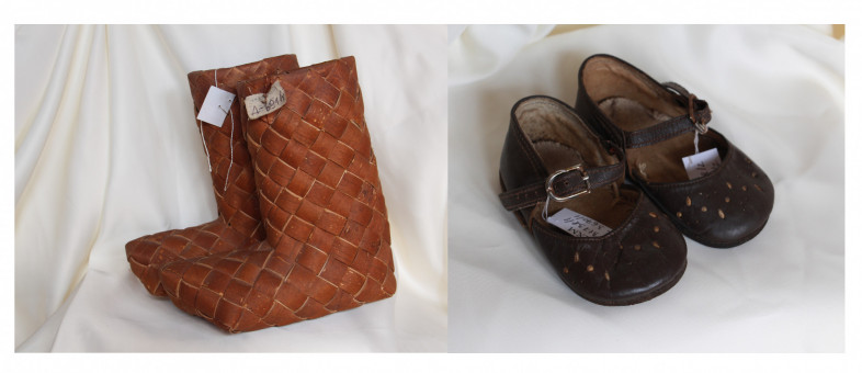 Первый комплекс, представленный на выставке – обувь из бересты. Самой древней, незатейливой и дешёвой обувью были общеизвестные плетёные лапти. Их плели из бересты, коры липы, ивы, вяза и можжевельника. На ноге лапти крепились с помощью верёвочных или тканых обор, которые продевались в специально сделанные на бортиках и заднике петли, крестообразно обвивали её и завязывались под коленом. Предварительно ногу оборачивали портянками – суконными или холщовыми полосками ткани. В городе лапти были в основном обувью для бедняков, их носили в будни и праздники. Срок ношения не превышал трех недель. Не зря говорили: – «В дорогу идти – пять пар лаптей плести». В XIX веке цена на лапти составляла три копейки в сравнении с сапогами за несколько рублей. Ноге в них было комфортно в любую погоду. Такую плетеную обувь можно было купить и на кирилловской ярмарке.