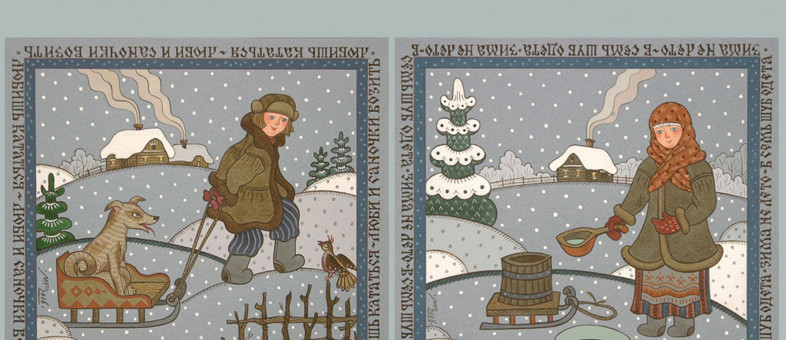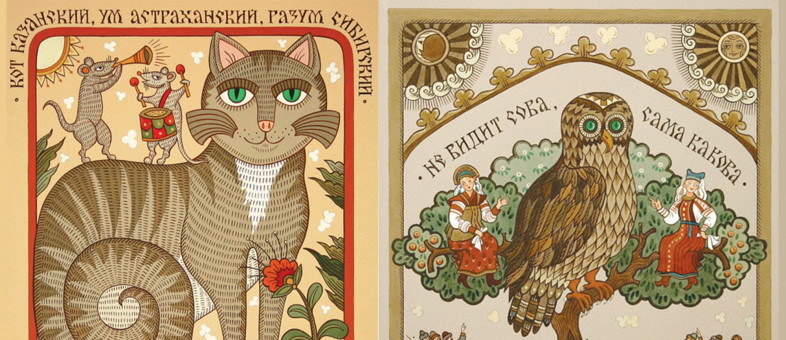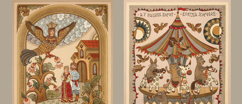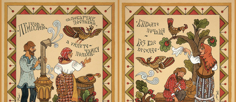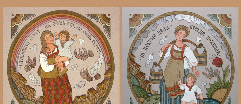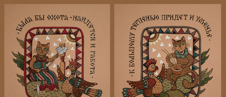Работы М. И. Русановой представляют живой взгляд профессионального мастера на народную традицию. С 1979 года она обучалась гобеленовому ткачеству в экспериментальной группе, созданной Художественным фондом РСФСР на базе Текстильного училища № 111 г. В тканевых картинах Русановой органично переплетаются традиции народного творчества и многодельная техника гобелена. Гобелен, или шпалера, это стенной односторонний ковёр с сюжетной или орнаментальной композицией, вытканный вручную перекрёстным переплетением нитей. Сюжетом гобеленов Русановой служат «народные мудрости» и пословицы, как известно, простые только на первый взгляд, что только подчеркивает кропотливая техника. Как для появления простой и лаконичной мудрости требуется опыт и время, так и для создания таких ясных и светлых гобеленов нужны долгие часы работы. Эта же тема продолжается в совершенной иной технике: графической серии «Русские пословицы». Ироничные изображения, в которых история складывается из простых линий и локальных цветов, восходят к русскому лубку: печатным листовкам, рассчитанным на широкую аудиторию. Сохраняя узнаваемую форму, Русанова наполняет ее своим собственным содержанием, учитывая особенности техники: например, если в уличном лубке зачастую встречаются неудачные сочетания локальных цветов, из-за чего изображение становится похожим на раскраску, то в руках мастера сочетания цветов напротив являются сильным местом, подчеркивают главное. Таким образом, М.И. Русанова не просто владеет различными техниками художественного ремесла, но использует их для создания замечательных художественных образов.Также на выставке представлены работы учеников С.В. Симанковой – учащихся 2-х классов “Детской художественной школы №1” города Череповца. На занятиях ученики знакомятся с замечательным и добрым материалом – соленым тестом.Жизнь наших предков была тесно переплетена с множеством обычаев и обрядов. В народе издавна отмечали пластические свойства теста и лепили из него самые различные фигурки.Лепка из соленого теста – старинный русский народный промысел – упоминается в летописях уже в XII веке. Для этой затеи замешивали тесто на воде, муке и соли. Любое прикосновение пальцев оставляет на тесте след, своеобразный узор. Лепные фигурки обязательно высушивали в духовом шкафу или печке, как пирожок, до румяности, а поделки становились твердыми, как камешки.Центром промысла является Русский Север, Архангельская область. Фигурки из соленого теста были не простыми игрушками: они играли магическую, ритуальную роль – служили оберегами.Традиции, связанные с лепкой декоративных и религиозных предметов из теста, существовали не только в России. В Чехии, Словакии, Польше лепили целые картины из теста. В Германии и Скандинавии издавна было принято изготавливать пасхальные и рождественские сувениры из соленого теста. Считалось, что эти украшения приносят хозяевам дома, который они украшают, удачу и благоденствие. В Греции и Испании во время торжеств в честь Богоматери на алтарь кладут великолепные хлебные венки, украшенные пышными орнаментами. Соленое тесто – экологически чистый материал, поэтому комочек светлого, мягкого, теплого теста дает ощущение чего-то живого и лепка взывает самые приятные чувства. Любая поделка из соленого теста, находящаяся