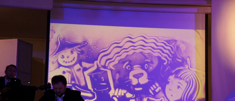 Детская аудитория с восторгом наблюдала за песочным "мультиком" на большом экране, который вниманию публики художник представил под звуки музыки солистов Национального академического оркестра народных инструментов России им. Н.П. Осипова и интереснейшей истории А.М. Волкова, рассказанной Александром Олешко!