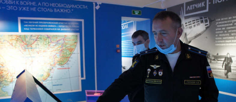 Интерес участников экскурсии вызвали измерительные приборы, представленные в витринах экспозиции, модель самолёта ДБ-3 и зал, посвящённый операции в Порт-Артуре, участником которой был Герой Советского Союза, генерал-лейтенант Е.Н. Преображенский. Тогда десантом было взято в плен свыше 10000 японских военнослужащих. Целыми и невредимыми были захвачены два японских сторожевых корабля – «Хайфэн» и «Хайлун», которые 13 сентября 1945 года переименовали в «Ветер» и «Штиль».