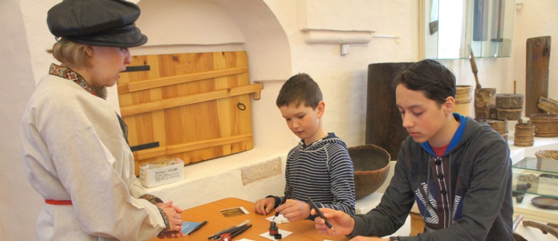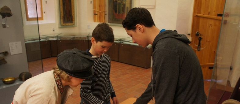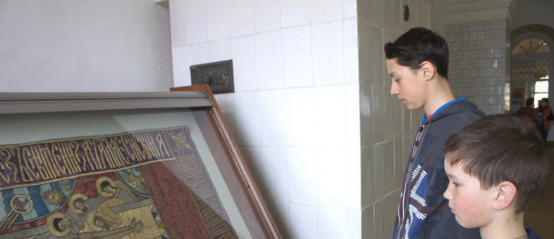 Участники квеста смогли не только попрактиковаться в ловкости в игре «Рыбалка», но и показать свою аккуратность, прилежность и трудолюбие в вышивании и каллиграфии. В зале, где представлено шитьё, они смогли вручную пришить бусинку к материи. После увиденной плащаницы «Положение во гроб», которую монастырю в 1645 году подарил граф Ф.И. Шереметев, отказаться от этого задания не смел никто. Мальчишки взяли в руки пяльца и сделали несколько аккуратных стежков.