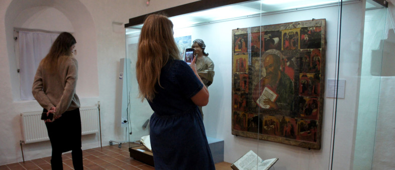 Юлия Веретнова отметила, выставку, реализуемую научно-просветительским центром «Индрик» при поддержке Президентского фонда культурных инициатив, в Кириллове дополнили эксклюзивными экспонатами из фондов Кирилло-Белозерского музея-заповедника. Безусловно, все предметы связаны с темой библейского Апокалипсиса. Здесь вы увидите скульптуру Иоанна Богослова конца XVIII века; копии фресок из интерьеров Успенского собора Кирилло-Белозерского монастыря; памятники древнерусской живописи, цаты и венцы с иконы «Архангел Михаил и Иоанн Предтеча» XVII-XVIII веков, выполненные костромскими мастерами и показывающие связь Кириллова с родиной Гурия Никитина – Костромой; старопечатные книги. Особый интерес представляют издания начала XIX столетия «Житие и чудеса Василия Нового» из собрания Музея фресок Дионисия и «Деяния и послания святых апостолов с Апокалипсисом на славянском и русском наречии» из собрания Кирилло-Белозерского музея-заповедника.