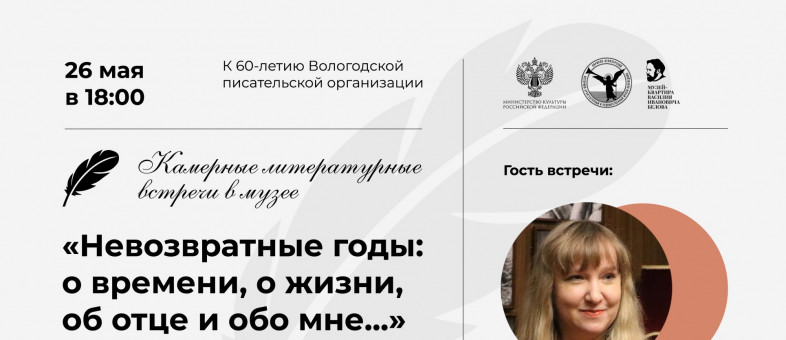 Филиал Кирилло-Белозерского музея-заповедника «Музей-квартира В.И. Белова» продолжает серию Камерных литературных встреч в музее, приуроченных к 60-летию регионального отделения Союза писателей России. В рамках проекта в музее проходят вечера, посвященные творчеству известных вологодских поэтов и прозаиков, встречи с их наследниками-детьми, ставшими продолжателями литературных традиций либо выбравшими собственный путь в жизни, а также творческие вечера с известными именами современной вологодской литературы.