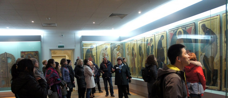 «В Кирилло-Белозерском музее-заповеднике мы были года три назад. Тогда меня восхитили огромные подлинные иконы начала XV века. И сегодня я очень ждала экскурсии в этот зал!» – рассматривая самую раннюю икону из Успенского собора «Успение Богородицы» музея-заповедника, говорит Лана Роджерс.