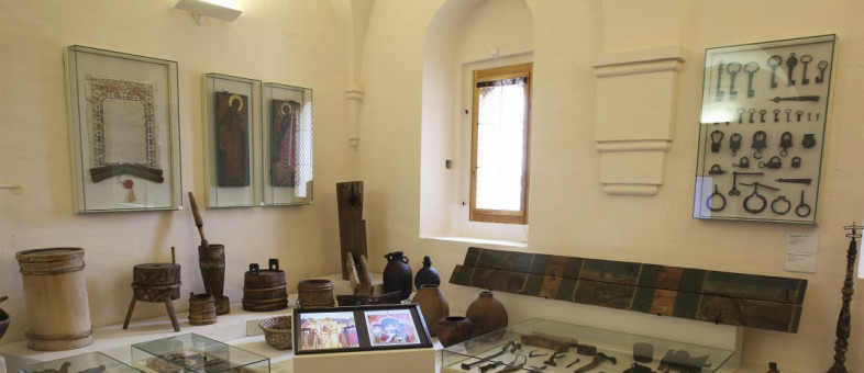 В 5 залах представлены резные и расписные прялки, сани, светцы для лучины и сундуки, крестьянская мебель, глиняная, деревянная, берестяная и металлическая утварь, узорные ткани, кружево, вышитые полотенца.