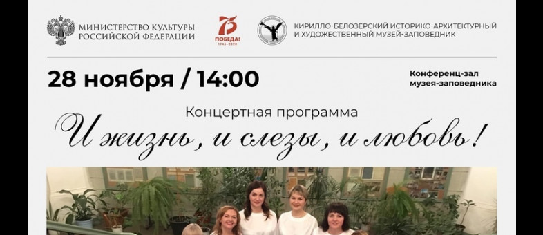 28 ноября в 14:00 в конференц-зале Кирилло-Белозерского музея-заповедника концертную программу «И жизнь, и слезы, и любовь!» представит ансамбль «Вдохновение» (п. Шексна).