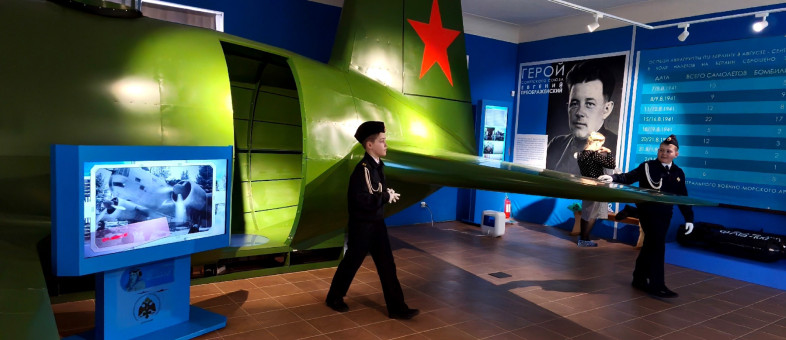 Главным экспонатом, привлекшим внимание юнармейцев и кадетов, стал макет бомбардировщика ДБ-3. Именно на таком самолёте Евгений Преображенский совершал вылеты на Берлин в 1941 году – это был ответ на воздушные атаки Москвы немцами. Такие полёты требовали мужества и выносливости: преодолевая расстояние в 1740 километров, пилот испытывал такое физическое напряжение, при котором мог потерять сознание и погибнуть еще на подступах к Берлину. Тем не менее, полк, которым командовал Преображенский, совершил девять вылетов! За участие в этих боевых операциях наш земляк получил звание Героя Советского Союза в самом начале войны! Позднее, с 1950 по 1962 Евгений Николаевич командовал авиацией Военно-морского флота СССР и завершил свою службу в звании генерала-полковника авиации.