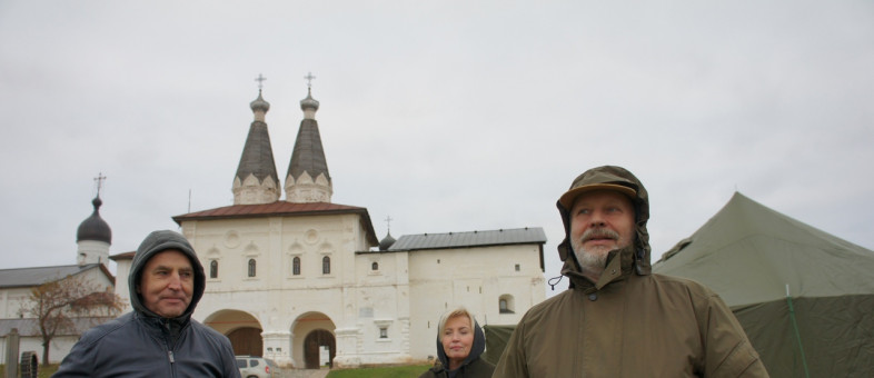 У стен Музея фресок Дионисия сейчас расположился палаточный городок - именно так выглядит съёмочная площадка фильма на Вологодчине. "По сюжету фильма на берегу озера будут бурить скважину, из которой польётся вода. Герои поймут, что внутри имеются пустоты, и возможно, здесь и находится та самая библиотека Грозного. Дублёр занырнёт в Бородаевское озеро и попадёт в водоворот, который унесёт его по разным коридорам. Но эту часть картины будут снимать уже в специальном павильоне..." - рассказывает соучредитель "Дома кино" А.Петровский.