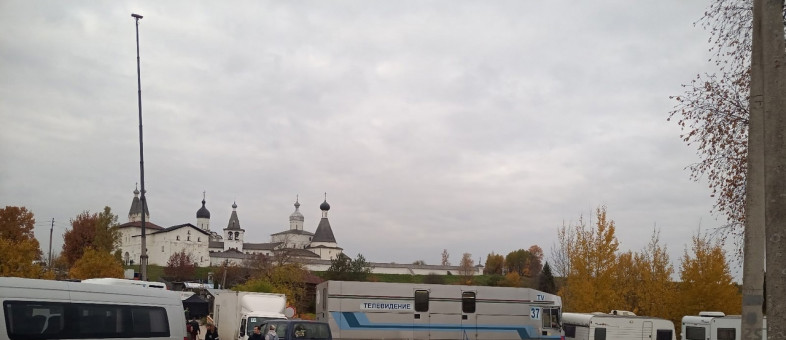 Гримвагены, буфеты, караван, световые вагены... Центральная площадь Ферапонтова в буквальном смысле заполнена техникой для съёмок фильмов. И это не случайно - на территории филиала Кирилло-Белозерского музея-заповедника - Музея фресок Дионисия - идут съёмки полнометражного фильма с рабочим названием "Сокровища Ивана Грозного".