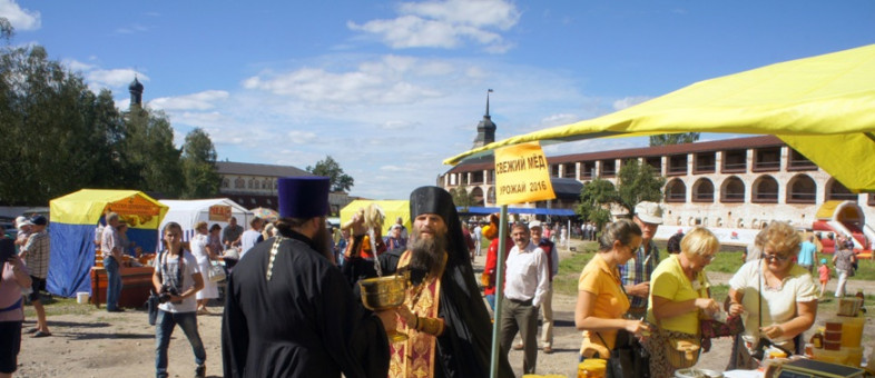 В разноцветных палатках, расположившихся на аллее Нового города, можно было приобрести медовую продукцию. Пчеловоды из Вологды и Кириллова заготовили свежий медок, а чтобы он был полезным и добрым, настоятель храма во имя Казанской иконы Божией Матери г. Кириллова протоиерей В. Колосов и иеромонах Кирилло-Белозерского монастыря о. Нил (Андрощук) совершили церемонию его освящения.