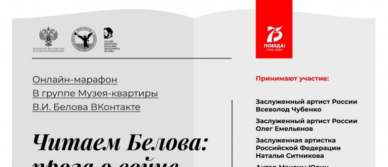 Девятого мая 75-летие Победы в Великой Отечественной войне 1941-1945 гг. Кирилло-Белозерский музей-заповедник отметит онлайн-акцией. В этот день с 12:00 до 19:00 в группе филиала Кирилло-Белозерского музея-заповедника - Музея-квартиры В.И.Белова (https://vk.com/belovmuseum) - состоится онлайн-марафон "Читаем Белова: проза о войне".