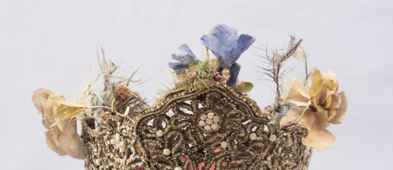 Венец выполнен в виде ажурной детали из холста. Ажурная деталь с просечным рисунком в виде 13 розеток из жемчуга, бисера, стразов и пайеток со стилизованным растительным орнаментом выполнена в технике «саженье по бели».