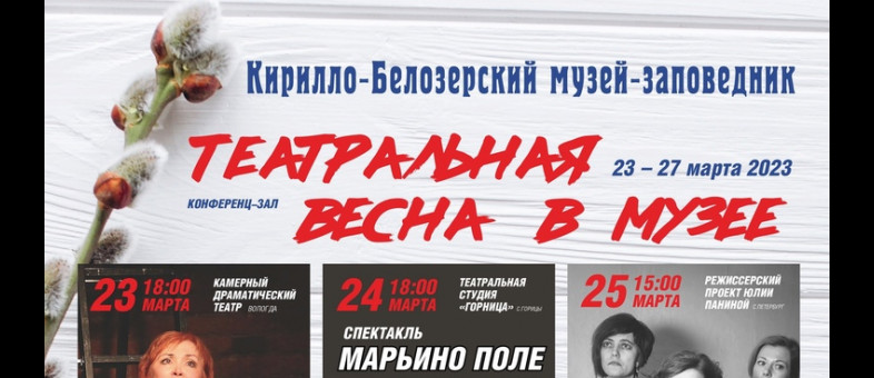 Кирилло-Белозерский музей-заповедник с 23 по 27 марта 2023 года впервые представит зрителю культурный проект «Театральная Весна в музее». Нашими гостями станут театральные коллективы из Вологды, Ярославля, Санкт-Петербурга. Отрадно отметить, что наряду с профессионалами, на музейной сцене, выступит самодеятельная студия «Горница» из Гориц.