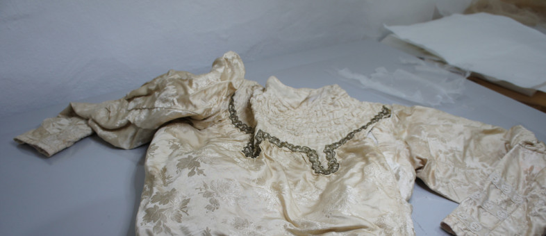 Я в настоящее время работаю над изделием 1930-х годов – восстанавливаю кофту-казачок, сшитую из узорного атласа, с отделкой из тесьмы бронзового цвета и воротником-стойкой. Этот памятник поступил на реставрацию в состоянии общего загрязнения, с пятнами различных цветов, разрывами и сечениями нитей. В некоторых местах были разорваны нити тесьмы. На данный момент мною уже выполнено ослабление пятен и произведена водная очистка, восполнены утраты. Далее предстоит сдублировать сечения по всей поверхности памятника, а также отпарить его и подготовить к дальнейшему экспонированию».