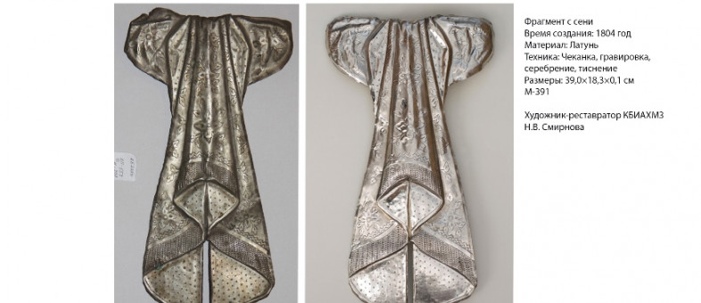 Художник-реставратор Н.В. Смирнова завершила реставрационные работы на памятнике коллекции «Металл». Вероятно, данный предмет является фрагментом сени, установленной над ракой преподобного Кирилла Белозерского в 1804 году. Предположение основывается на фотоматериалах, выполненных С.Н. Прокудиным-Горским в 1907 году в церкви Кирилла Кирилло-Белозерского монастыря. Похожие детали находились под карнизом, между воланами бархата.