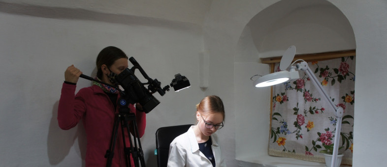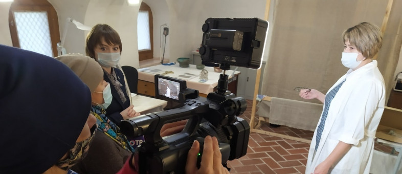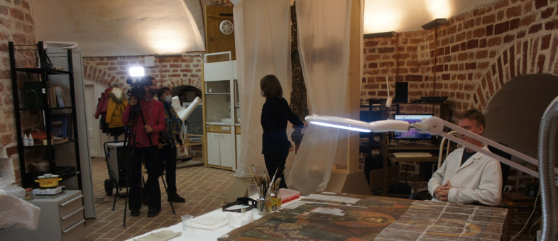 Реставрационные мастерские Кирилло-Белозерского музея-заповедника посетили журналисты телеканала ОТР Екатерина Якунова и Елена Тойвонен.