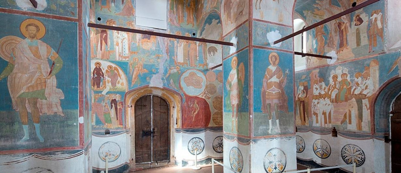 В этом же уровне на стенах четверика – Вселенские соборы, главной темой которых является борьба с ересями за чистоту веры. Такое сочетание композиций нижнего, опорного яруса росписей, усиливает звучание темы защищенности как всего христианского мироздания, воплощенного в стенописном ансамбле, так и каждой христианской души.