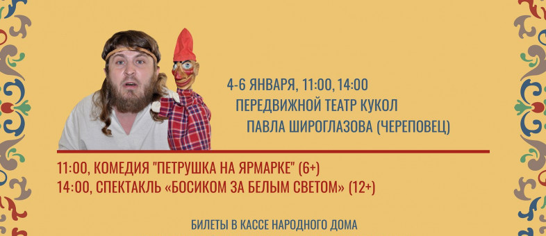 С 4 по 6 января в выставочном комплексе Кирилло-Белозерского музея-заповедника – Народном доме – передвижной театр кукол «ЕТИШКИНА ЖИЗНЬ», под руководством Павла Широглазова, представит комедию "Петрушка на ярмарке" и философскую сказку для детей и взрослых о вечном противостоянии добра и зла "Босиком за белым светом".