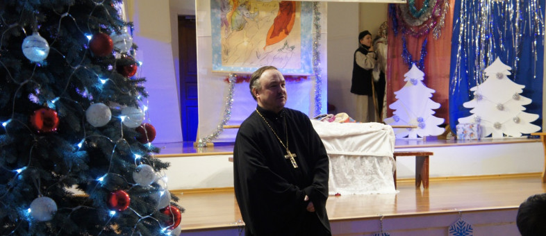 С приветственным словом перед спектаклем к зрителям обратился отец Кирилл (Виноградов). Всех присутствующих он поздравил с праздником Рождества Христова, рассказал о чуде рождения Господа Всемогущего, создателя Вселенной, и напомнил, что это выступление детей особенное - оно прославляет Христа Спасителя.