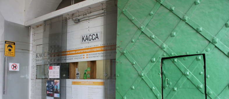 Здесь же, справа, находится касса (в ней вам не только продадут билеты, но и измерят температуру тела, предложат воспользоваться санитайзером для рук), а слева – пост охраны, сотрудники которого круглосуточно следят за сохранностью культурного наследия нашей страны. Они же пропускают сотрудников музея через маленькие дверцы, встроенные в конструкцию огромных врат Казанской башни. Обратите внимание на створы – раньше они наглухо запирались железными засовами!