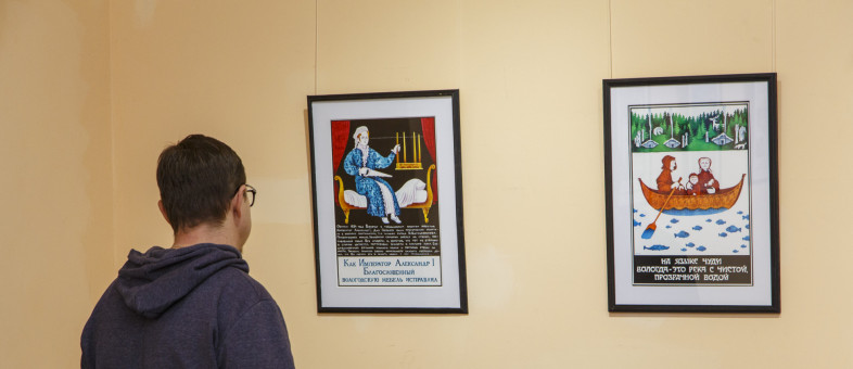 На картинах двух залов Народного дома – иллюстрация жизни русского народа. Здесь вологжане отправляются на строительство Санкт-Петербурга; отмывают золото в реках области; рассуждают о финно-угорских племенах; вспоминают приезд императора Александра I в Вологду. Всё это посетителям выставки показал художник-график, иллюстратор, архитектор-реставратор, член Союза художников России Владимир Лупандин.