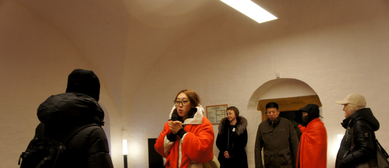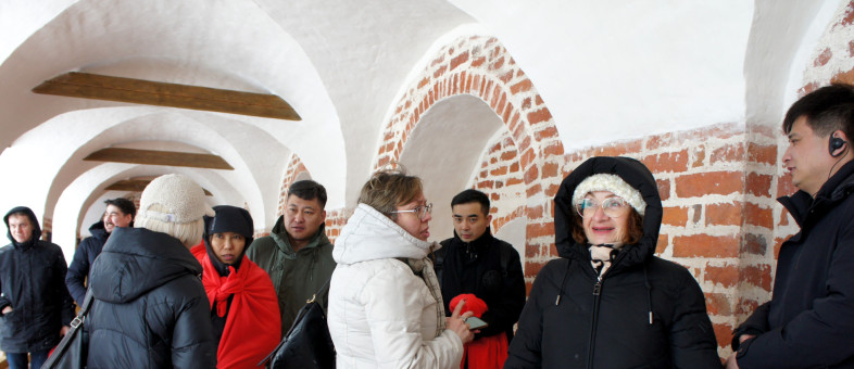 Первым объектом показа стали крепостные стены XVII века. Экскурс в историю создания и реставрации фортификационных сооружений гостям из Китая сделала экскурсовод первой категории Кирилло-Белозерского музея-заповедника Ольга Кузьмичева. Туроператоров поразили виды, открывающиеся с высоты птичьего полета; заинтересовал интерьер Казанской башни и большеразмерный кирпич (30-32 см * 14-16 см * 7-9 см), из которого строили стены крепости.