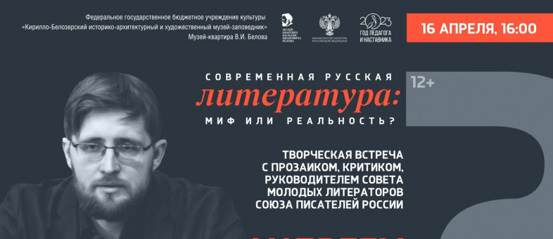 «Современная русская литература: миф или реальность?» – ответ на этот вопрос даст Андрей Тимофеев, прозаик, критик, руководитель Совета молодых литераторов Союза писателей России. Творческая встреча с писателем пройдёт 16 апреля в филиале Кирилло-Белозерского музея-заповедника «Музей-квартира В.И. Белова».