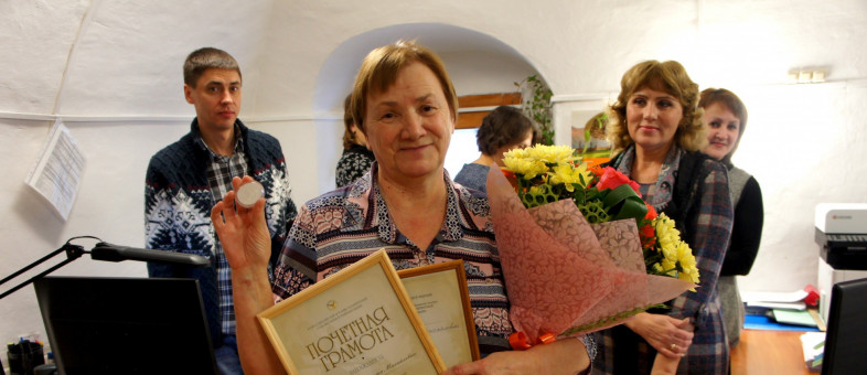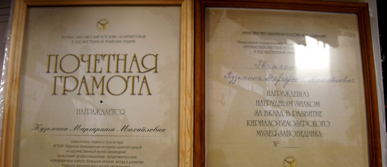 В такой чудесной атмосфере в присутствии коллег и руководства Кирилло-Белозерского музея-заповедника Маргарите Михайловне Кузьминой была вручена Почётная грамота генерального директора Музея М.Н. Шаромазова «За высокий профессионализм, продолжительную и безупречную работу, большой личный вклад в развитие Кирилло-Белозерского музея-заповедника».