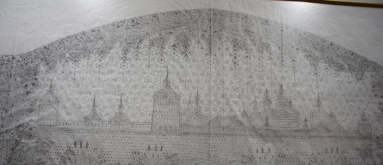 Панно «Благословенный день» выполнено плетением на коклюшках из льняных нитей белого цвета. Работа выполнялась шестью мастерицами.