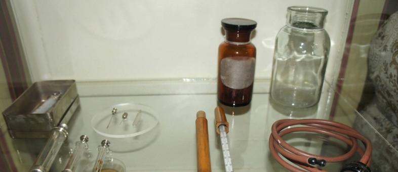 В витрине можно увидеть пинцеты, шприцы, иглы, стерилизаторы, ингалятор, фонендоскоп – всё, что было необходимо врачу общей практики для осмотра больных и оказания помощи.
