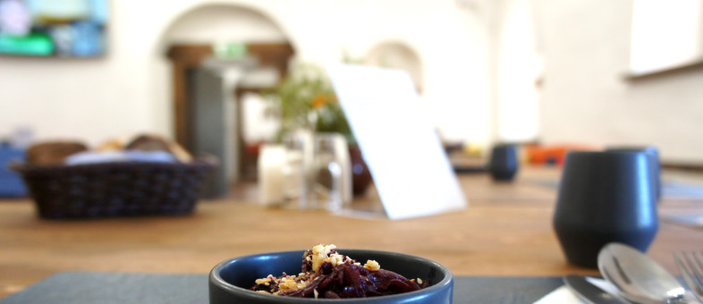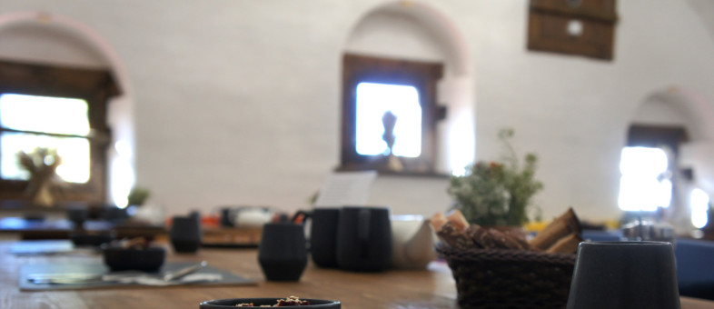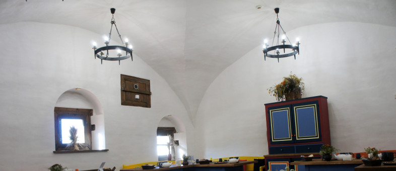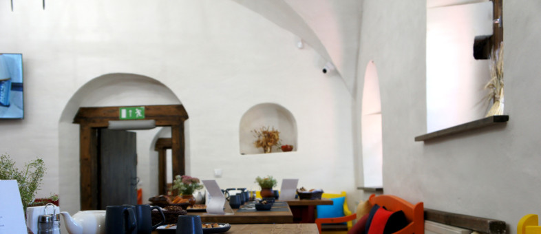 Здесь, в прясле крепостной стены XVII века, под белыми сводами, гостей угощали блюдами местной монастырской кухни.