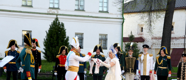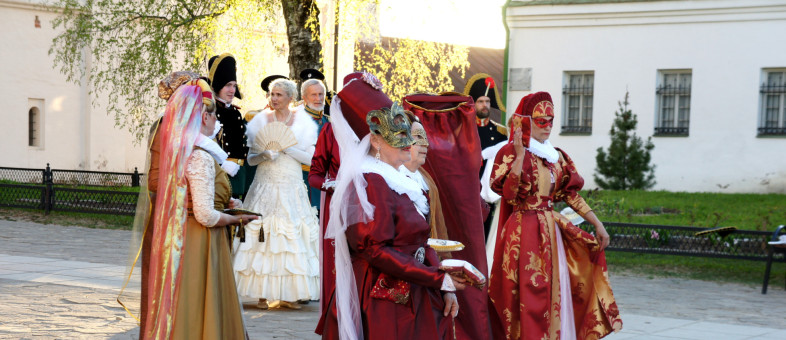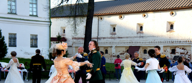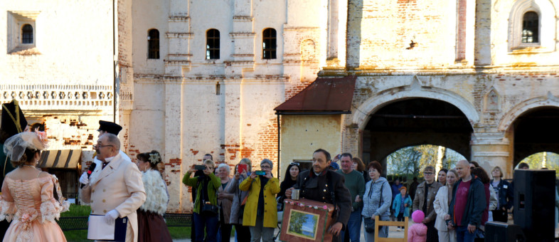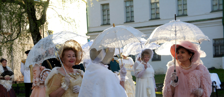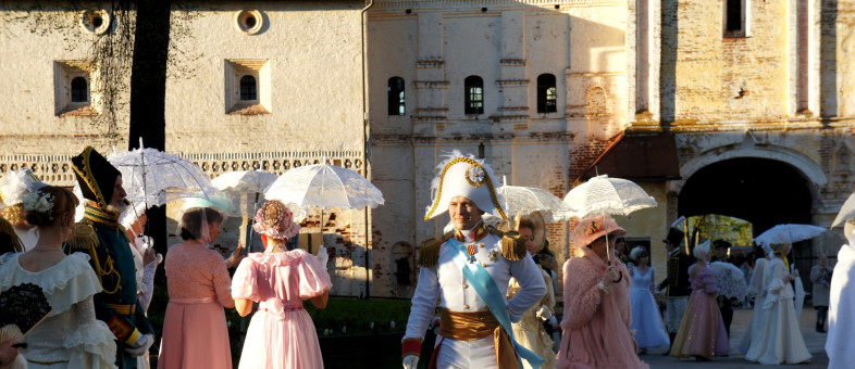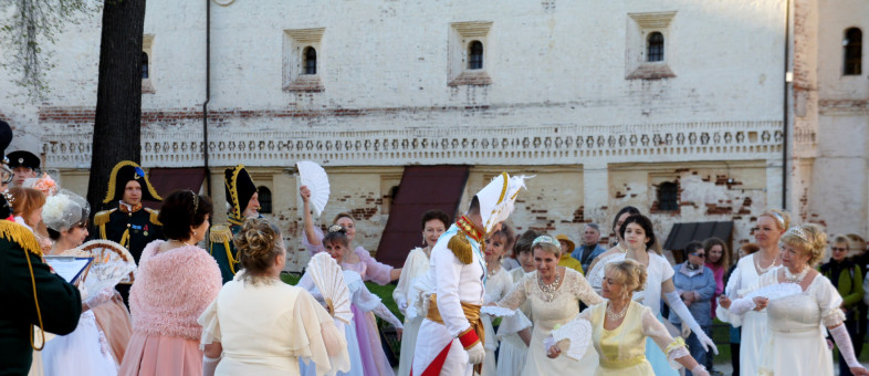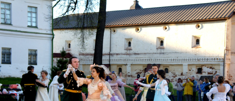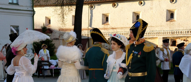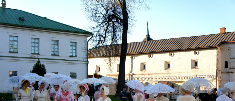 Дамы с кружевными зонтиками и веерами, в платьях с корсетами и белых перчатках, мужчины – в мундирах. Всё это в окружении белоснежных архитектурных сооружений Кирилло-Белозерского музея-заповедника.