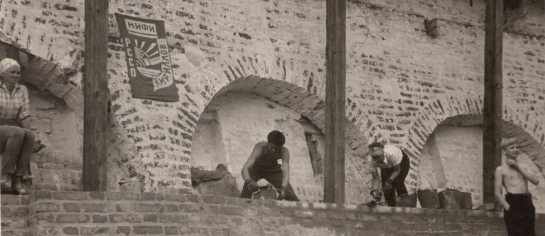 А начиналось все в конце 60-х, когда лучшие из лучших студентов МИФИ разных специализаций: энергетической, вычислительной техники, экспериментальной, получив комсомольскую путевку в начале июня, отправлялись на реставрационные строительные участки в музей. До 30-35 человек было ребят в отрядах, проживали в двухэтажной деревянной в прошлом школе, в наши дни рядом находится администрация Кирилловского района, два сезона жили в помещениях 1 яруса, примыкающих к Казанской башне. Барышень один-два и обчелся, в основном в стройотряде МИФИ были ребята.